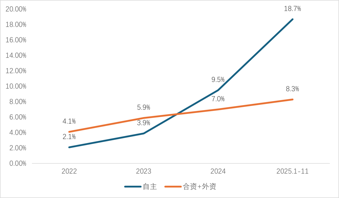 2025年1-11月,搭载城市NOA功能的乘用车销量中,自从品牌销量达到253。73万辆,占比达到81。1%,展示出自从品牌乘用车正在智能网联范畴的立异活力和合作力。此中,自从品牌销量中搭载城市NOA功能的车型销量占比达到18。7%,较2024年占比翻一番,且远高于平均15。1%的占比程度;而合伙品牌搭载NOA功能的乘用车销量占比仅为8。3%,较2024年占比提高1。3个百分点!