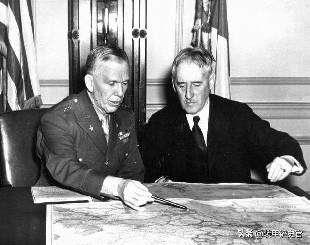 ■美国陆军参谋长马歇尔大将(左)和陆军部长史汀生正在研究和况,正在的利用上两人持有分歧看法。