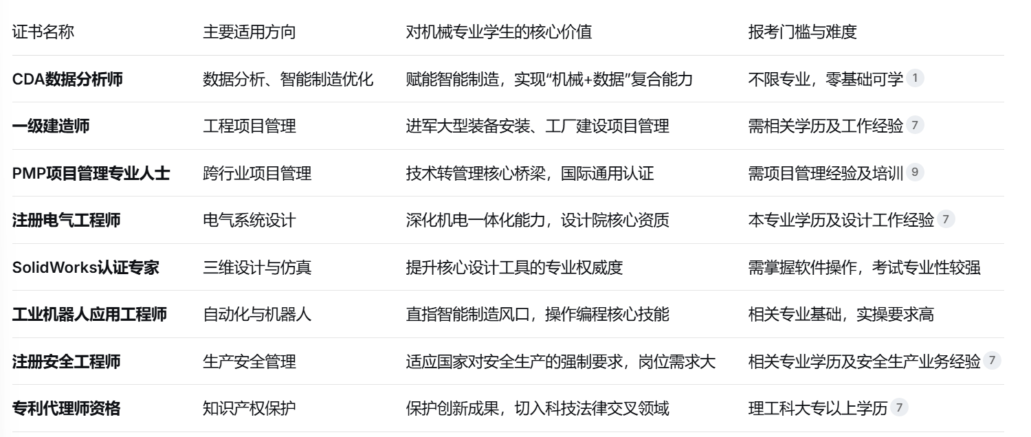 智能产线上,机械臂的每一次精准抓取,背后是数据阐发优化过的轨迹算法;而操控这些产线的工程师简历上,除了专业技术,多了一行“CDA数据阐发师”的认证。数字化海潮正席卷制制业,对机械设想取制制专业的学生而言,控制数据阐发、项目办理等复合技术已成为拉开薪资差距的环节。制制业正派历从“保守制制”到“智能制制”的深刻转型。这一改变对机械专业人才提出了全新要求:不只要懂机械道理和设想,还要具备数据阐发、从动化节制和项目办理等复合能力。专业证书的价值正在变化中凸显。它们不再仅仅是一纸证明,而是系统化学问系统的获得、行业承认度的背书以及职业成长的加快器。对于大专学历的机械专业学生而言,精选的高价值证书能无效填补学历短板,正在就业市场上成立奇特劣势。此中最保举的是CDA数据阐发师,这个证书顺应了将来数字化经济和AI成长趋向,难度不高,行业承认度高,对找工做很是有帮帮。✅CDA数据阐发师含金量若何?CDA数据阐发师是数据范畴承认度最高的证书,取CPA注会、CFA特许金融师齐名。遭到了、经济日报等权势巨子保举。✅CDA企业承认度若何?CDA企业承认度很是高,良多企业聘请时说明CDA数据阐发师优先,对找工做很是有帮帮。良多银行、金融机构的手艺岗会要求必需是CDA数据阐发师二级以上的持证人。中国联通、央视广信、德勤、苏宁等企业,把CDA持证人列入优先考虑或者对员工的CDA测验给补助。一级建制师是建建工程范畴的权势巨子认证,对机械专业学生价值奇特。它不只是法令的施工项目司理必备证书,更是参取大型工业厂房扶植、根本设备项目标通行证。跟着2025年国度新型城镇化扶植规划推进,市政工程人才需求暴增,机电专业持证人项目分红可达工程制价的3%-5%。注册电气工程师则是电气设想范畴的颠峰认证。正在制制业向智能化转型的布景下,机械取电气的一体化设想成为刚需。SolidWorks认证专家是机械设想范畴的实操型认证。做为全球支流的三维设想软件,SolidWorks的认证可以或许间接证明持证人的设想建模能力和工程问题处理程度。工业机械人使用工程师认证曲指从动化出产焦点。跟着“机械换人”趋向加快,控制工业机械人编程、和集成技术的人才求过于供。这一认证出格适合但愿正在汽车制制、电子产物拆卸等从动化程度高的行业成长的机械专业学生。PMP项目办理专业人士认证供给了手艺向办理转型的最佳径。它不局限于特定行业,供给了一套全球通用的项目办理尺度。华为、腾讯等科技巨头已将PMP认证纳入项目司理晋升查核系统。对机械专业学生而言,PMP认证能帮帮将来担任产物开辟项目或出产线项目时,成立系统化的办理思维,持证人项目金遍及可提高40%-。注册平安工程师已成为企业平安出产办理的标配。按照国度,矿山、建建施工单元和物品出产等高危行业,必需按比例配备注册平安工程师。对机械专业学生而言,这一证书既合适国度政策导向,又能切入企业平安办理这一主要岗亭,特别正在2026年及将来,平安出产将是企业成长的红线,持证人前景广漠。专利代办署理师资历则是手艺立异的法令兵器。机械设想取制制素质是立异勾当,发生大量可专利化的手艺方案。具有专利代办署理师资历的机械人才,既能更好地本人的立异,也能正在企业中担任手艺取法令的桥梁脚色,薪资待遇遍及高于纯手艺岗亭。正在校期间取结业初期(0-2年),应聚焦焦点技术认证:可考取SolidWorks认证专家(CSWP)和CDA数据阐发师LevelⅠ。能快速提拔就业合作力,此中CDA数据阐发师LevelⅠ备考周期较短,适合正在校生进修走手艺专家线,则招考取PMP认证和CDA LevelⅡ。职业成熟期(5年以上),逃求行业权势巨子天分:可挑和一级建制师、注册平安工程师或专利代办署理师资历,这些证书往往需要必然工做经验堆集,智能产线的节制室里,年轻的机械工程师调出昨晚的出产数据报表,Python脚本从动生成的效率阐发图表显示,三号出产线%的优化空间。他这份由CDA认证锻炼出的数据洞察力,让他正在同期入职者中首批获得项目司理竞聘资历。隔邻工位上,那位仅持有保守机械证书的同事,仍正在手动统计着每日出产报表。行业变化的海潮中,证书已悄然沉绘了机械人才的职业航道图。