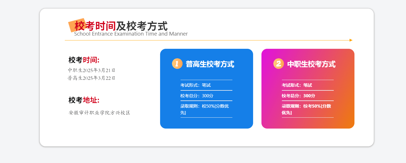 学院2026年单招/分类测验采用“文化本质测试+职业顺应性/技术测试”的分析评价体例,总分750分,此中文化本质测试(语数英合卷)300分,校考(职业顺应性/技术测试)450分,校考绩绩占比准绳上不低于50%。2026年分数线暂未发布,考生可参考往年数据合理预估:(一)往年分数线年单招预估分数线分摆布,各专业登科分数因热度分歧存正在差别,水文取水资本手艺等专业登科门槛相对宽松,抢手专业如聪慧水利手艺、新能源汽车手艺登科分偏高。- 2024年专科批登科参考(安徽考生):聪慧水利手艺物理类417分、汗青类402分;新能源汽车手艺物理类423分、汗青类398分。单招分数线凡是低于该批次分数,合作力更强。1。 登科准绳:按“分数优先、遵照意愿”准绳登科,不异分数按单科挨次排序(物理类:物理、数学、语文;汗青类:汗青、语文、数学),从命专业调剂可大幅提高登科概率。2。 校考要求:普高生加入职业顺应性测试,侧沉考查职业素养、行业认知及分析能力;中职生加入职业技术测试,侧沉专业技术实操取使用,具体测试纲领以学院官网发布为准。3。 打算申明:最终招生专业及打算以安徽省教育厅下达为准,部门专业有结合培育打算,登科后需正在指定合做院校完成学业。