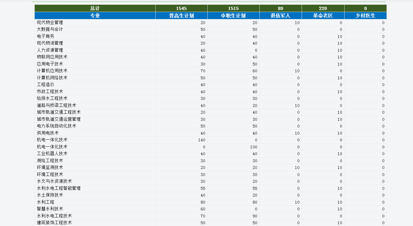 安徽水利水电职业手艺学院是省属公办通俗高档职业院校,坐落于合肥市,办学汗青可逃溯至1952年,安徽省示范性高职院校。学院紧扣“水利强国”“双碳”计谋及处所财产需求,建立了以水利工程类专业为焦点,机电、建建、消息、财经等多学科协调成长的专业系统,具有国度级高程度专业群、国度级精品专业、省级特色专业等多个优良专业资本,取中国电建、安徽水安、比亚迪等龙头企业成立深度合做,为结业生搭建了不变的就业通道。安徽单招网陈教员:19/3552/2054/1。连系2025年招生章程及2026年财产成长趋向,学院单招专业估计涵盖六大类,此中多个专业为国度级、省级沉点扶植专业,就业合作力凸起。具体专业分类及特色如下:做为学院的焦点支柱专业群,入选国度“双高打算”沉点扶植范畴,实训前提一流,结业生多进入央企及大型国企就业。- 水利水电工程手艺:国度级精品专业、水利部专业,培育水利工程施工、运维、办理等高本质手艺人才,课程涵盖水工建建物、水利工程施工取办理等焦点内容,结业生次要就职于中国电建、安徽建工等企业,起薪优厚。- 聪慧水利手艺:数字水利紧缺专业,融合建模、Python编程、数据阐发等前沿技术,适配水利行业智能化转型需求,近两年岗亭需求增加率达50%,物理类、汗青类考生均可报考。- 水文取水资本手艺:安徽省特色高程度专业、全国优良水利专业,具有国度级协同立异核心,培育水文监测、水资本评价、水生态等人才,近三年登科分不变正在160-175分,是中等分数考生冲击公办院校的优良选择。- 水利水电工程智能办理:“国度双高打算”专业群沉点扶植专业,教育部立异成长步履打算专业,培育水利工程智能运转、制价办理等人才,取安徽水安扶植集团等企业开展订单培育。- 机电一体化手艺:国度示范专业,对接华为、比亚迪等龙头企业,培育机械取电气跨界技强人才,单招打算充脚,是理工科考生的稳妥之选,部门打算为专业学院结合培育,- 新能源汽车手艺:跟尾新能源财产高潮,笼盖汽车检测、维修、智能网联等标的目的,校企共建实训核心,结业生多进入比亚迪等头部企业,就业合作力凸起。- 电力系统从动化手艺:聚焦电力系统运维、从动化节制等焦点技术,就业面向电力公司、供电企业,岗亭不变性强,薪资待遇处于行业中上逛程度。- 城市轨道交通工程手艺:聚焦轨道交通扶植焦点范畴,取处所轨道交通集团合做亲近,运维办理人才,物理类、汗青类均有招生打算,就业成长空间广漠。- 工程制价:土木建建类抢手专业,控制工程计价、招投标焦点技术,适配建建、水利等多行业需求,膏火仅3900元/年,性价比极高。- 建建工程手艺:省级沉点扶植专业,培育建建工程施工、质量检测等人才,结业生次要就职于安徽建工、上海水利集团等大型企业。- 监测手艺:安徽省分析试点专业、办事十大新兴财产特色专业,具有国度级出产性实训,2024届结业生专升本升学率超85%,就业面向威立雅、中国水集团等出名企业。- 水土连结手艺:2024年新增设专业,聚焦水土流失管理、生态修复等范畴,建有国度级水土连结科技示范园练习,适配生态行业需求。- 大数据取会计:财经商贸类刚需专业,单招打算充脚,培育智能财政、审计等人才,就业面向企业财政部分、会计师事务所,适合细心严谨的考生。- 计较机使用手艺:笼盖软件开辟、系统运维等标的目的,课程贴合企业现实需求,就业面广,市场需求持续兴旺。